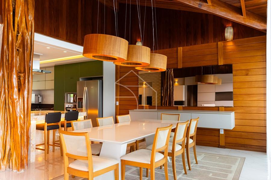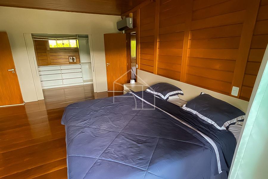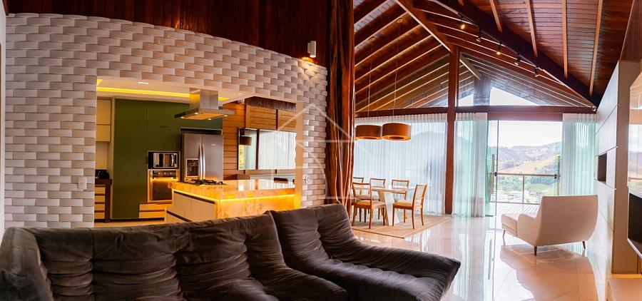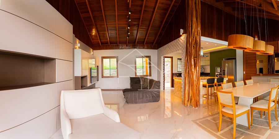 Com estrutura em madeira nobre e acabamentos de alto padrão, a casa foi pensada para valorizar cada detalhe. A integração entre sala de estar e cozinha gourmet cria um ambiente acolhedor, perfeito para reunir amigos e familiares.