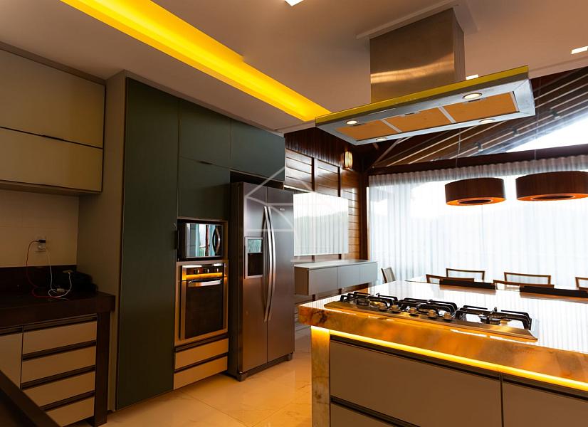 • Cozinha gourmet equipada com armários planejados e bancada em mármore translúcido
